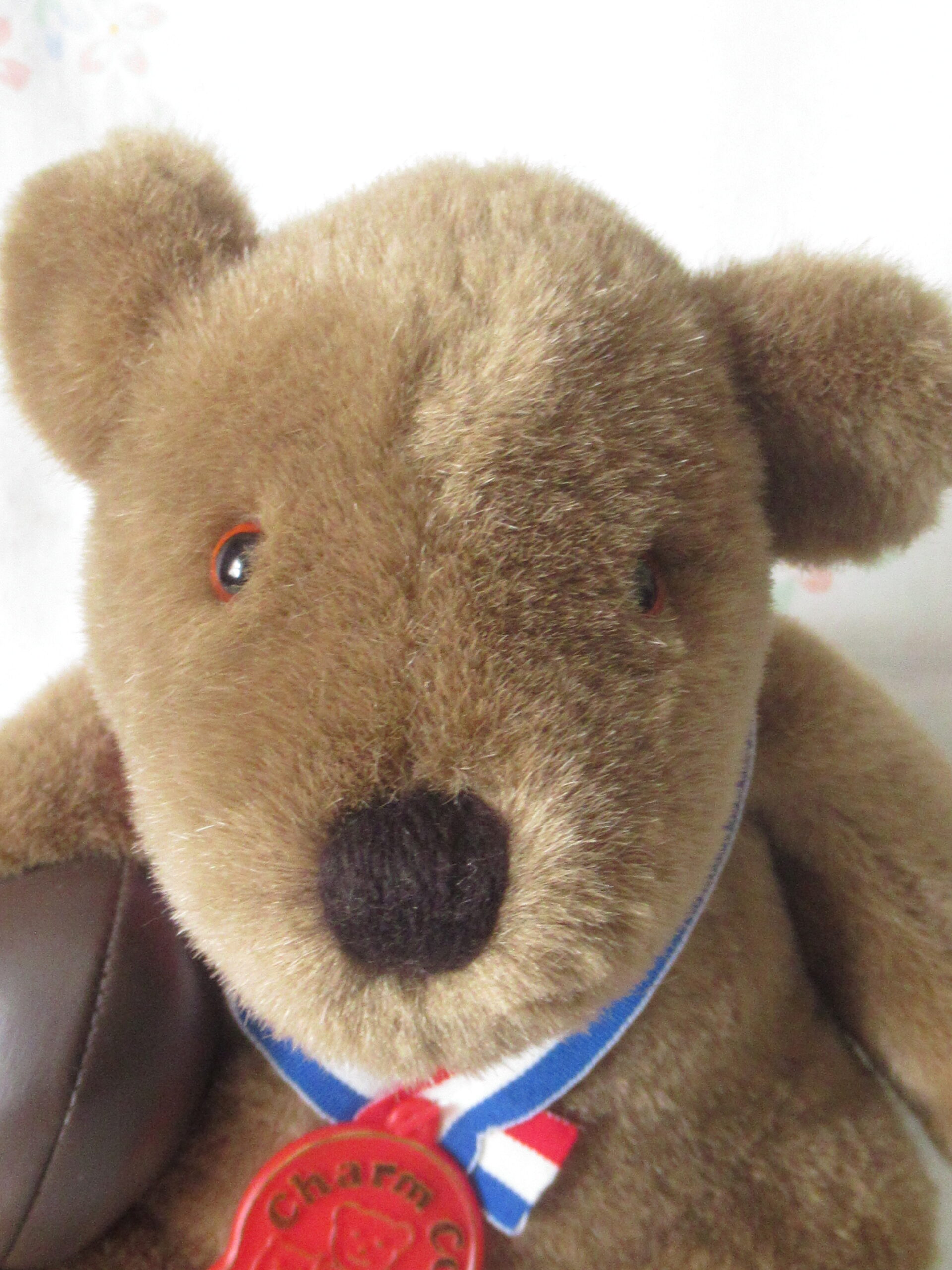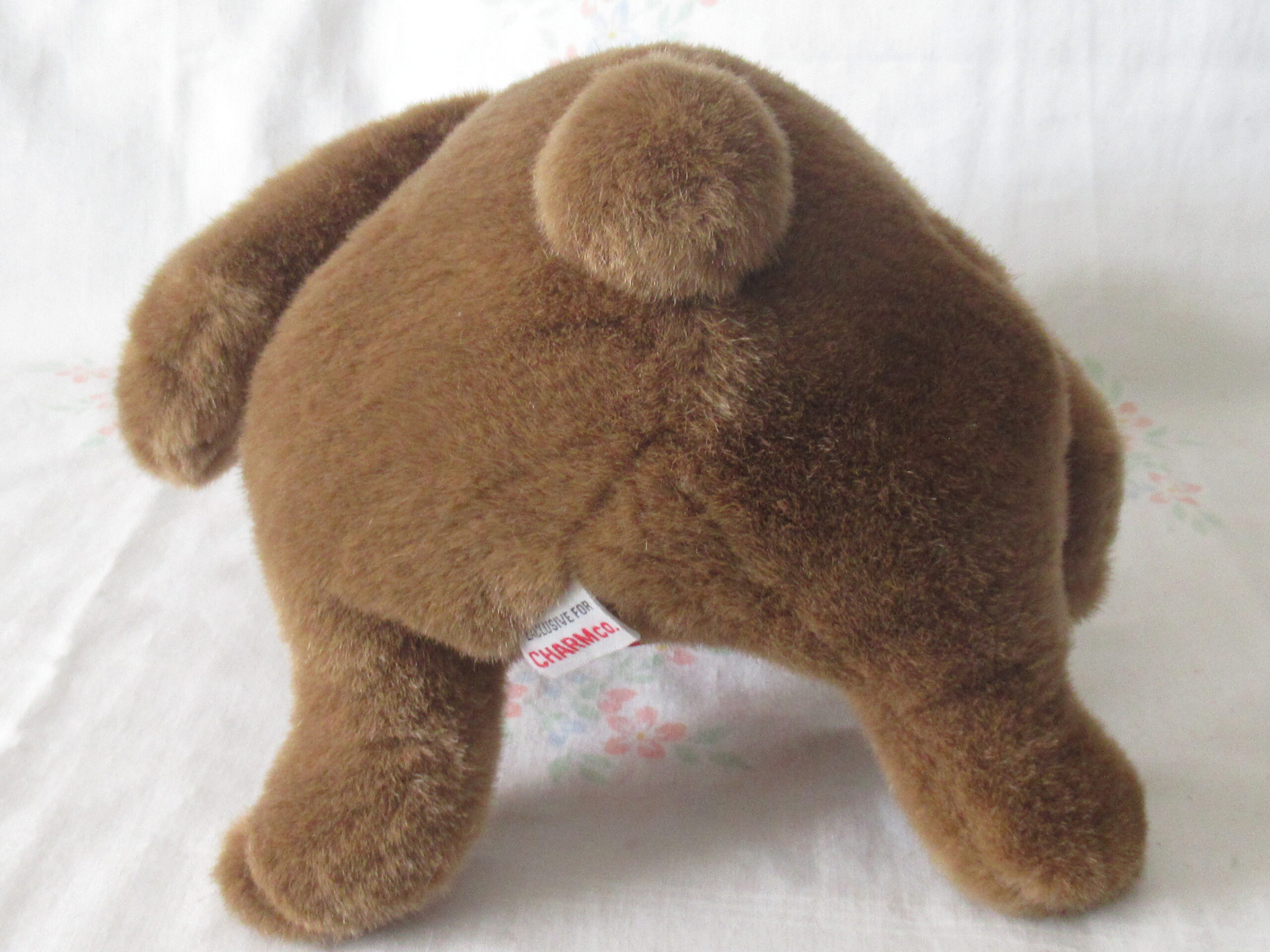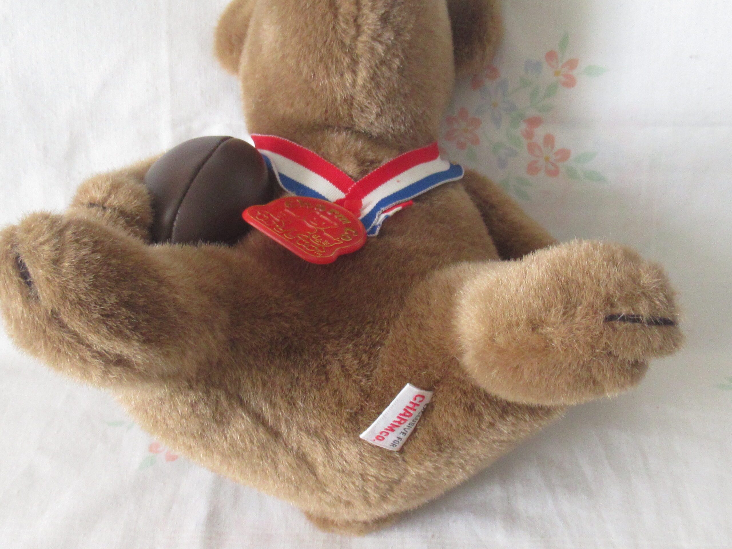 Bear is holding ball and has ribbon around neck with Charm Co plastic tag.  Please note partial sticky price tag on reverse of plastic tag.