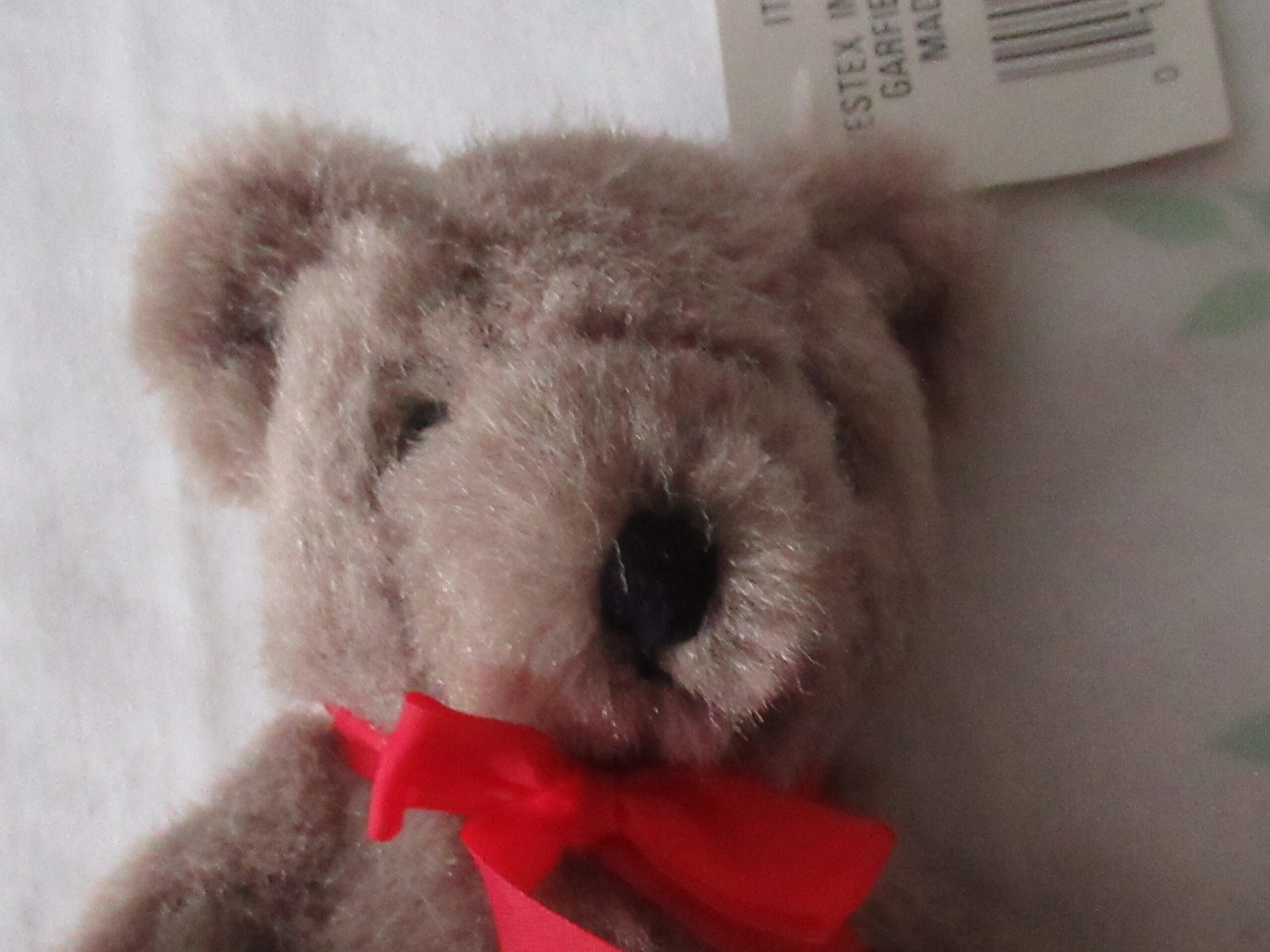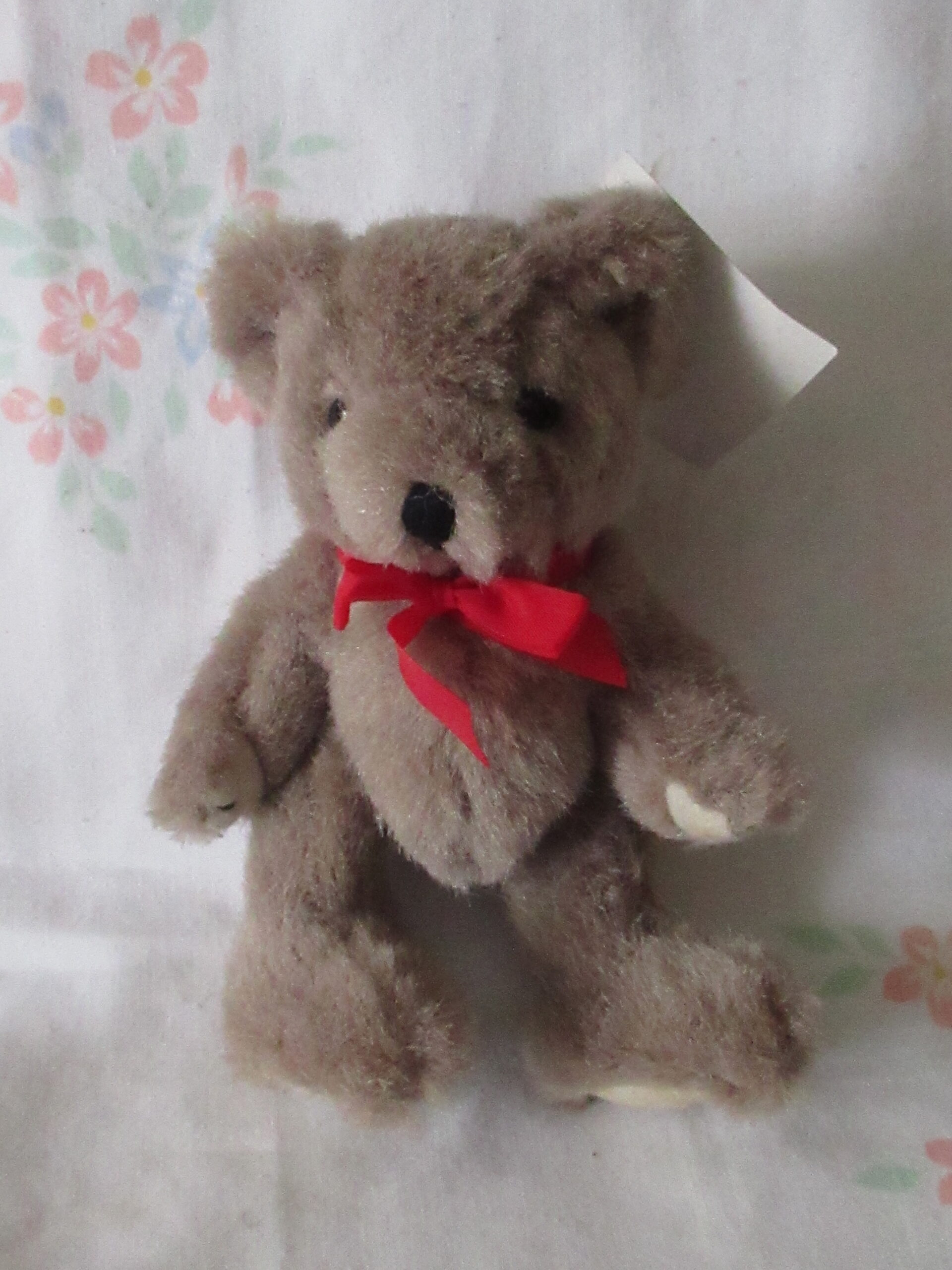 Bear has a red bow. Bear’s paw pads have discoloration.