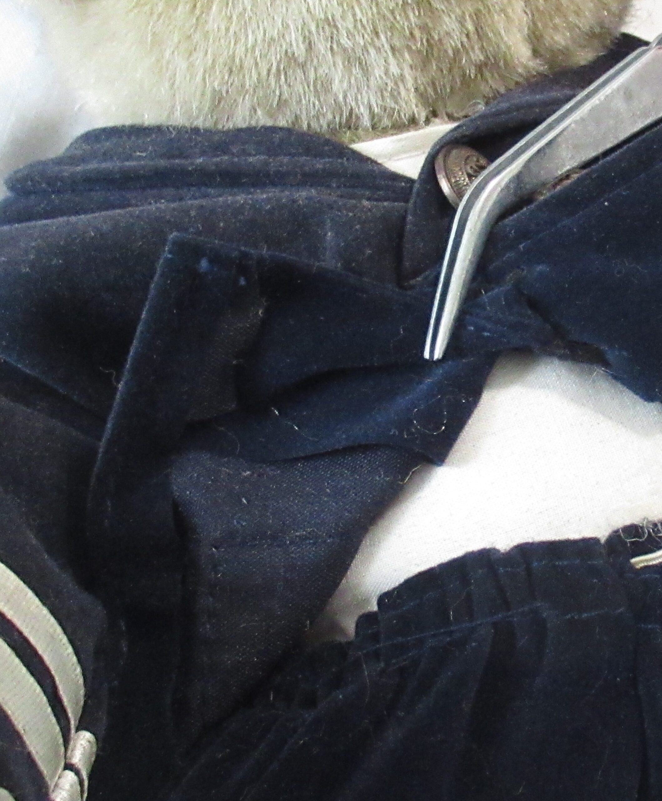 Bear has white material on chest under jacket. Bear has glue on left hand as if he had been holding something.